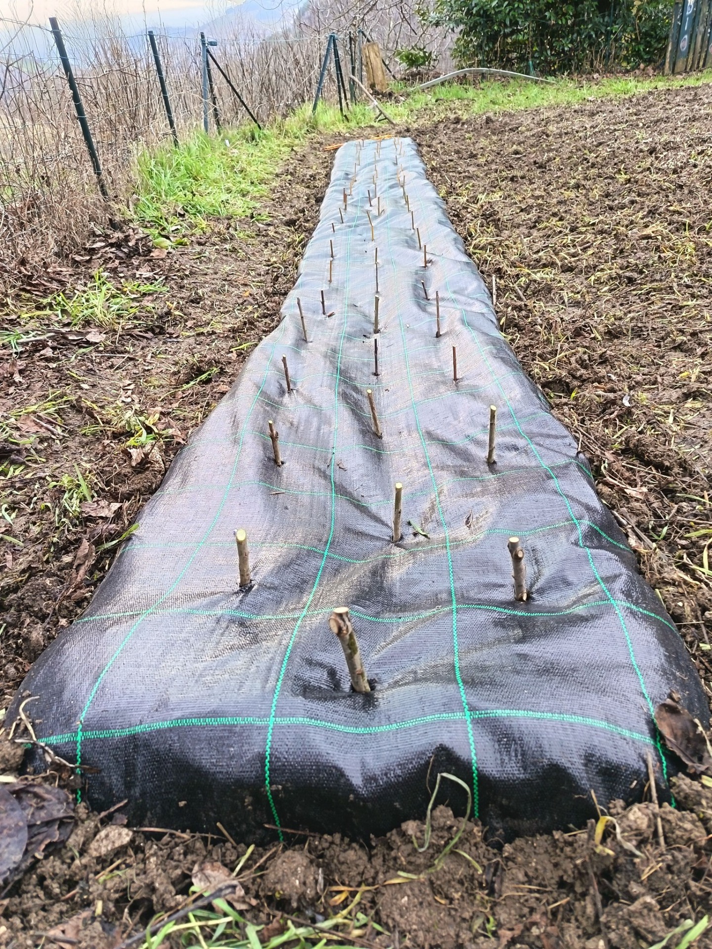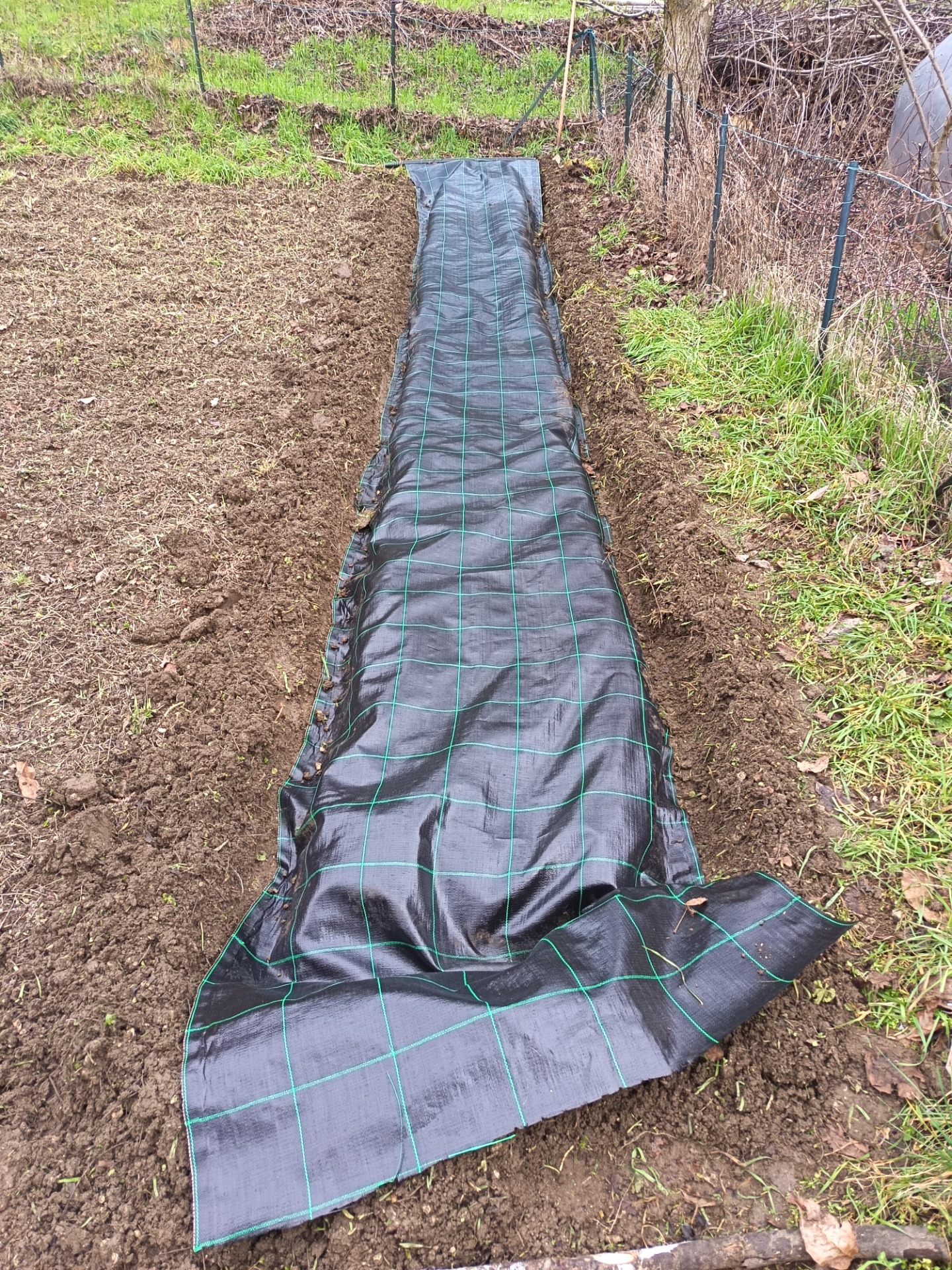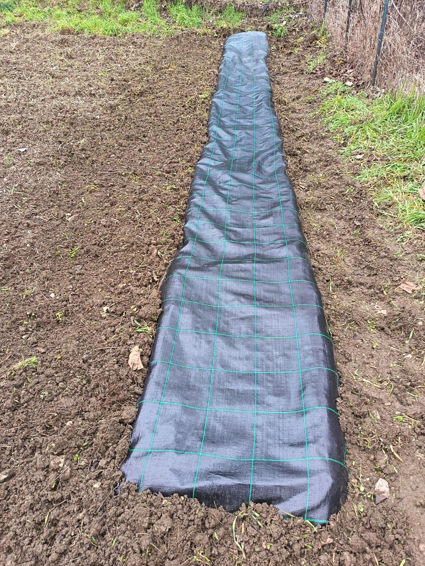 2^ FASE: Stesura del telo pacciamante: stendere un telo (larghezza 1,05 mt) sopra il terreno avendo cura di interrarne il perimetro (15 cm).